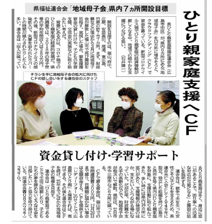 ひとり親家庭支援へCF 広島県福祉連合会、「地域母子会」県内7カ所開設目標