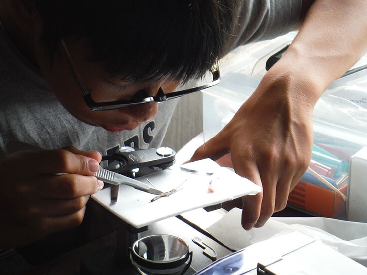 午前中は、フィールドでヤマビルの採取、午後は実験室でヤマビルと遊ぶ。その中から自由研究のテーマを見つけていく活動を提供します。