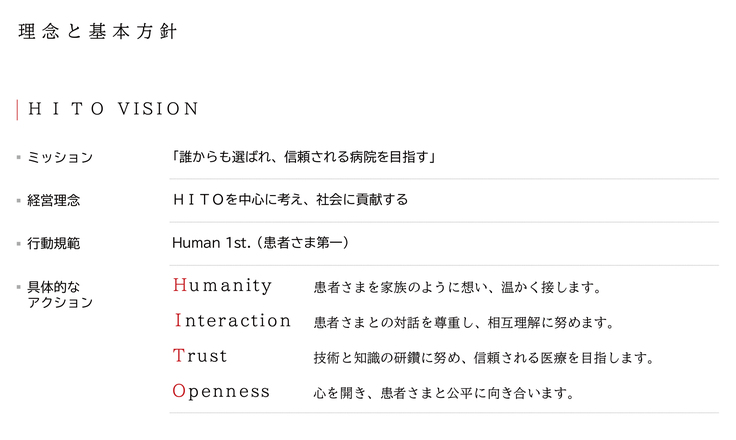 という具体的なアクションの頭文字からとったものであり、スタッフはHITOマインドを念頭に日々の医療に従事しています。