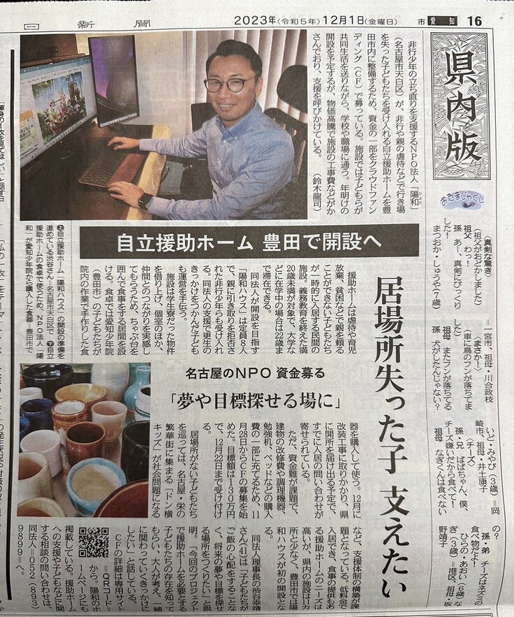 中日新聞朝刊に掲載「自立援助ホーム開設」