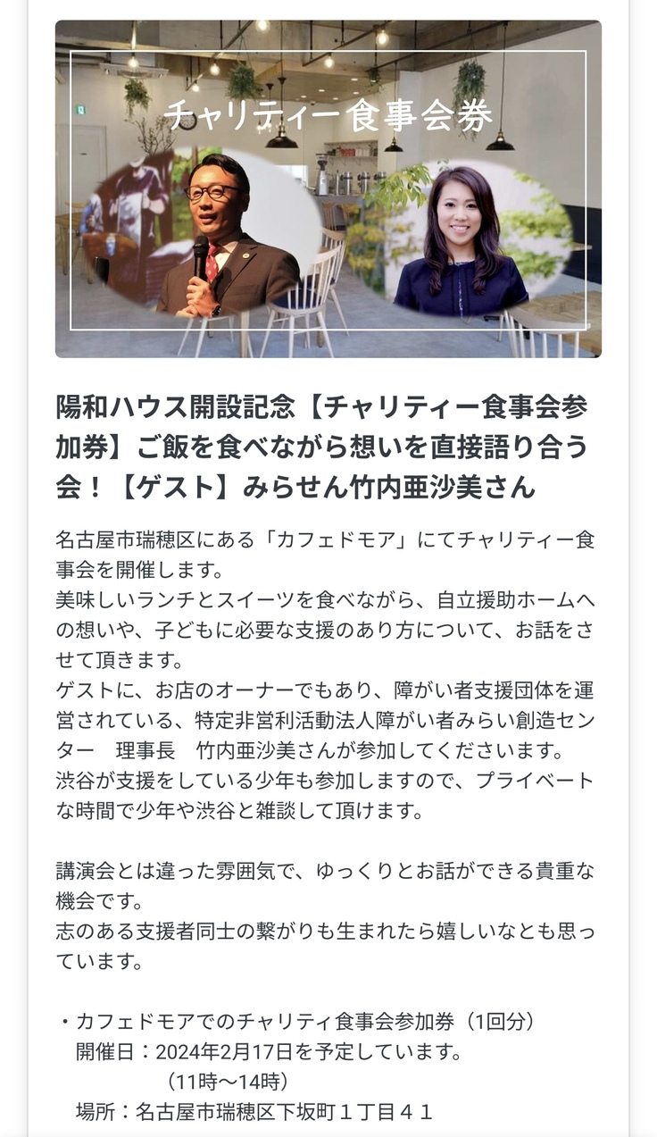 命をかけて障がいを持った子ども達と向き合っておられる、竹内亜沙美さんをゲストにお招きしてお食事会を開催します。