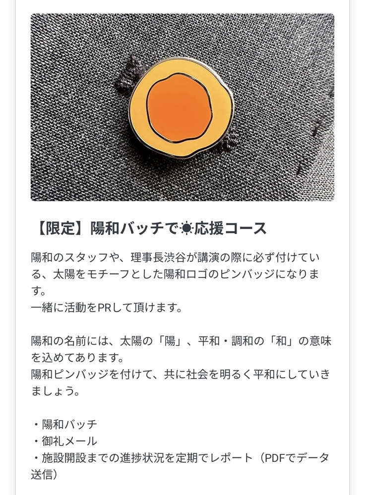 太陽をモチーフにした可愛いデザインで、子ども達にあたたかい光が届くように、社会や家族と調和できるようにという想いが込められています。