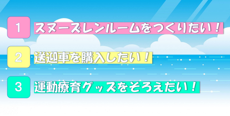 集まった資金は以下の用途で使用させていただきます。 ①スヌーズレンルーム・・・「家庭用プラネタリウム」「サイドグロー」など:約5万円 ②送迎車・・・約75万円(+実費60万円) ③運動療育グッズ・・・「マット」「鉄棒」「バランスストーン」など約6万円