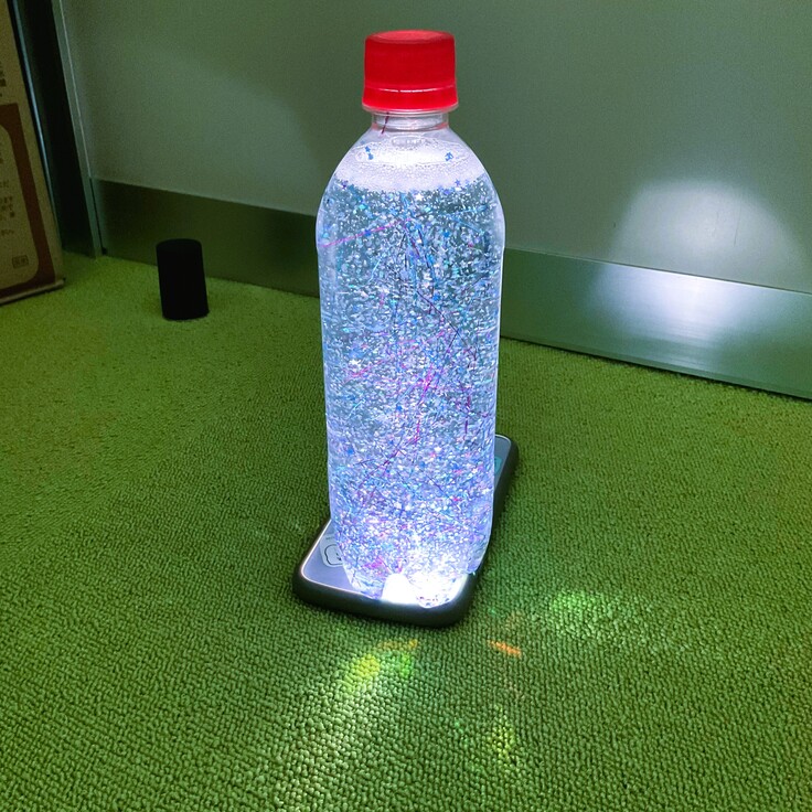 ✺自作のスヌーズレングッズ:ライトを当て、光の動きを視覚的に楽しみます。