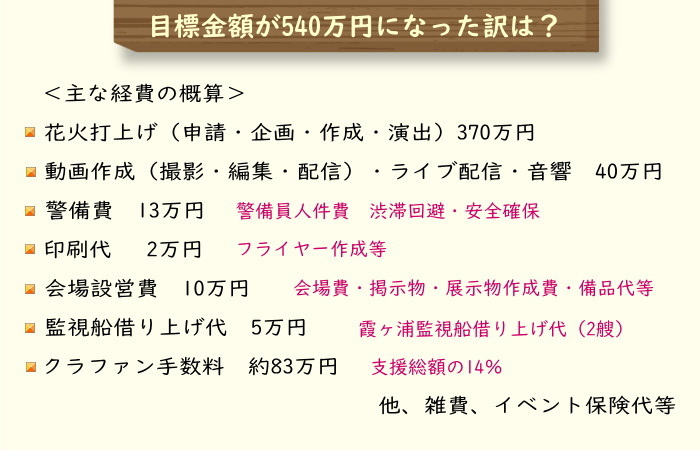 目標額に達しない場合は、花火の規模が小さくなったり、「天外者」の音楽が付かなくなってしまいます。