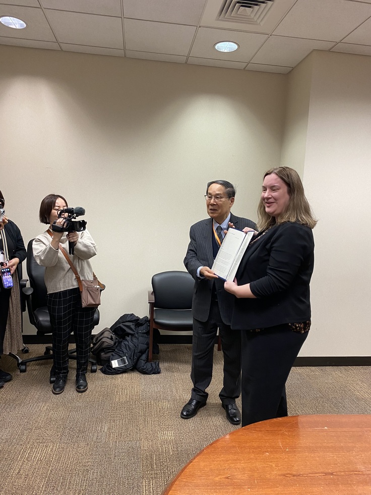 ブランドン・ジョンソン市長(民主党)は予算審議、移民をめぐる問題への対応などで時間がとれず面会は叶いませんでしたが、代理の方にお渡しいたしました。