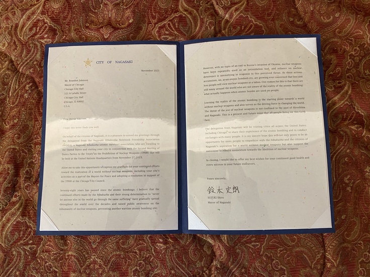 長崎市長の親書を携えてシカゴ市庁舎を訪れました。