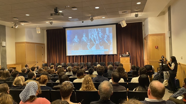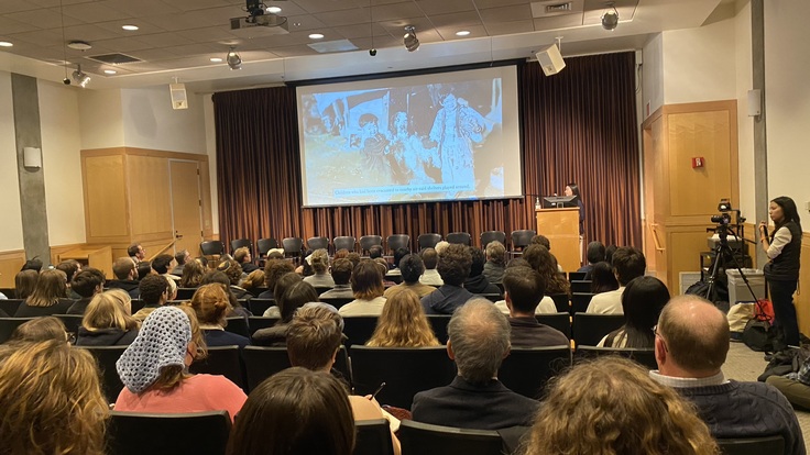 冒頭「Do You Know HIBAKU-SHA?」の問いを投げかけました。そのあとに今回のアメリカツアーについてのお話をしたあと、RECNA(長崎大学核兵器平説研究センター)協力による映像「about NAGASAKI」を上映し、被爆前と被爆後の市民の日常について知っていただきました。