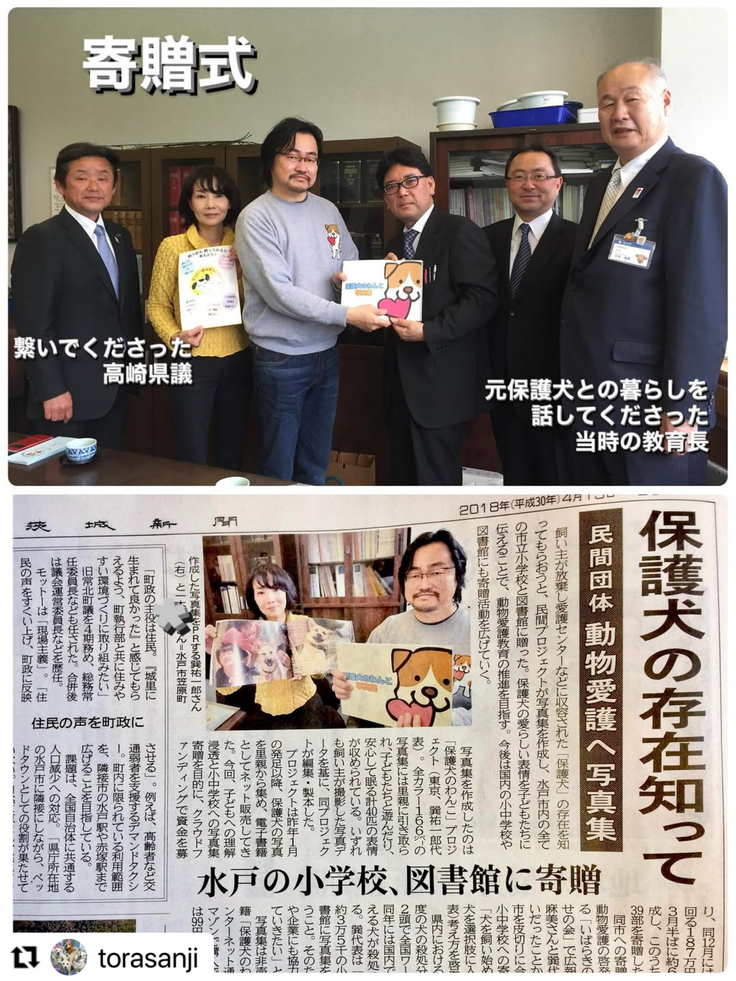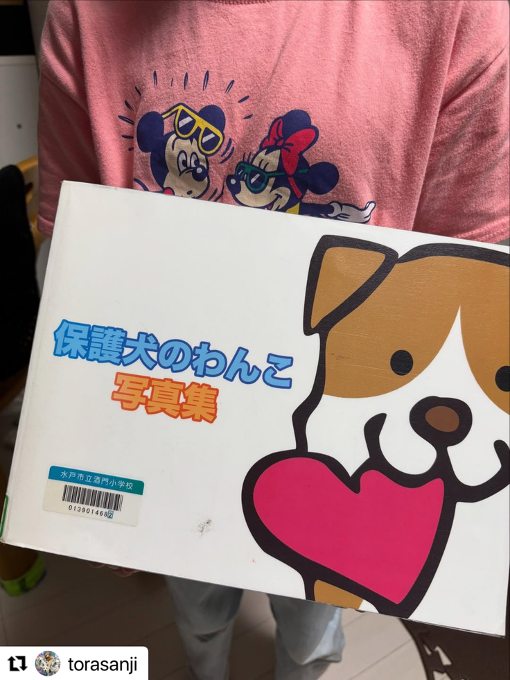トラオに似た子がいたから図書室から借りてきた.ᐟ.ᐟと8歳児が見せてくれたのは 7年前に市内全小学校と図書館に寄贈した『保護犬のわんこ』 写真集☆