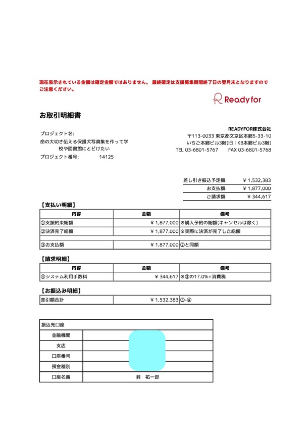 入金は最終的なご支援の合計金額1,877,000円からReadyforさんへのクラウドファンディング経費 344.617円を差し引いた1.532.383円になります。*入金の明細と入金記帳を最後に添付します。