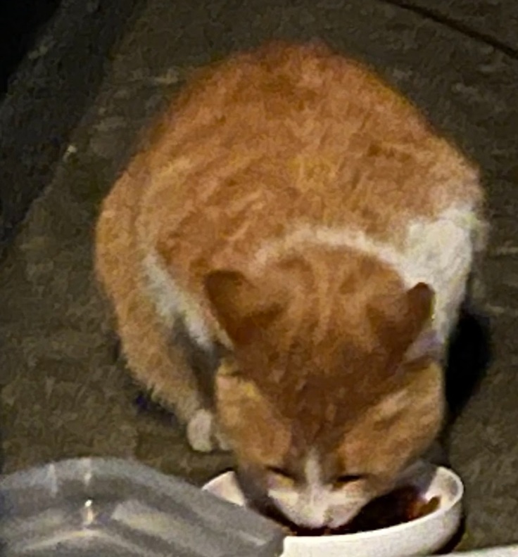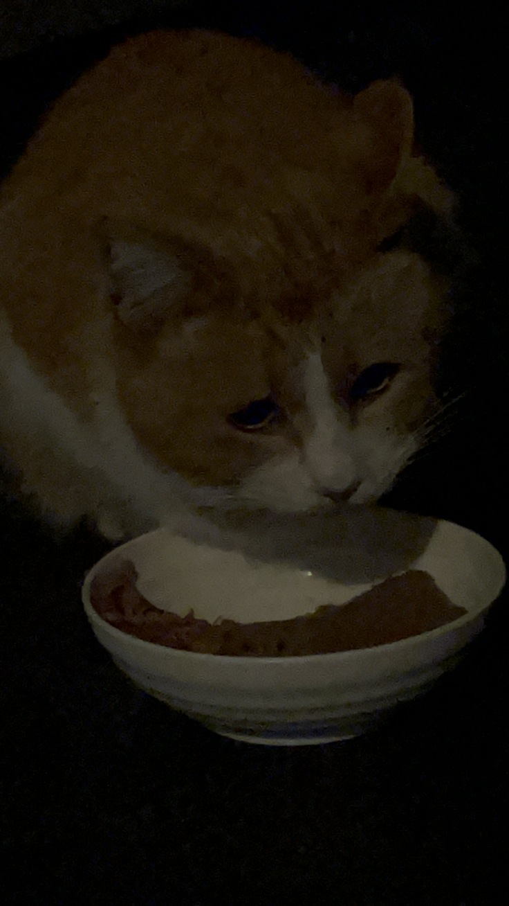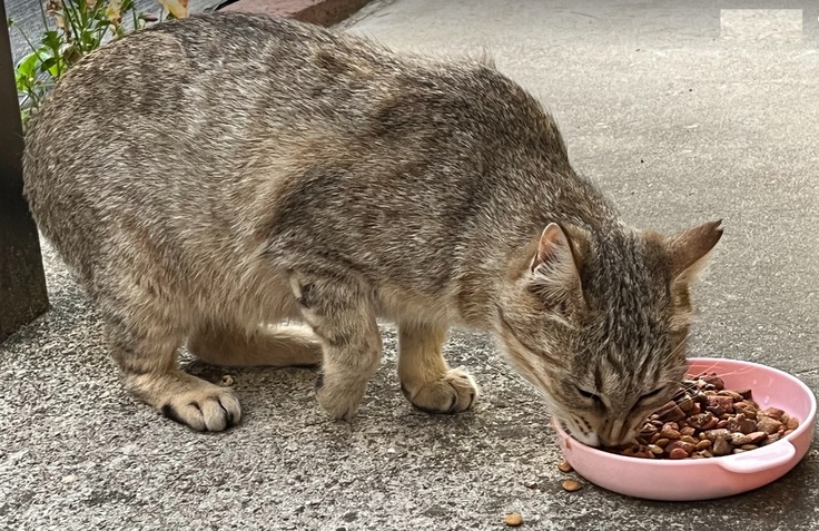 弱い子であるため、食べ終わるまで見守らないと、すぐに他の猫に攻撃されてしまいます。