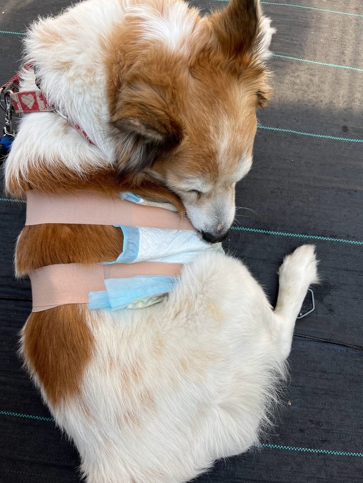病院でペットシーツをお腹に巻かれた休憩中のトットです