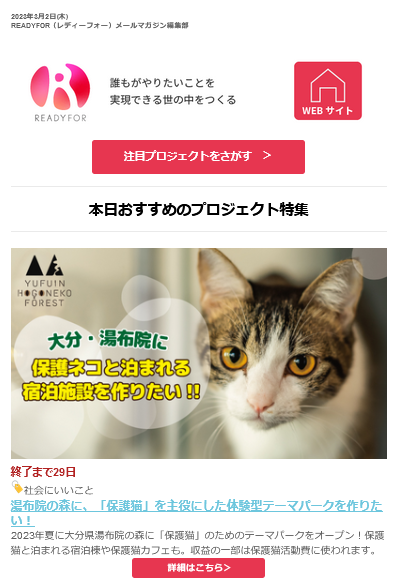 2023年3月2日(木)に、READYFOR(レディーフォー)メールマガジン編集部さんの「本日おすすめのプロジェクト特集」として当プロジェクトが紹介されました。