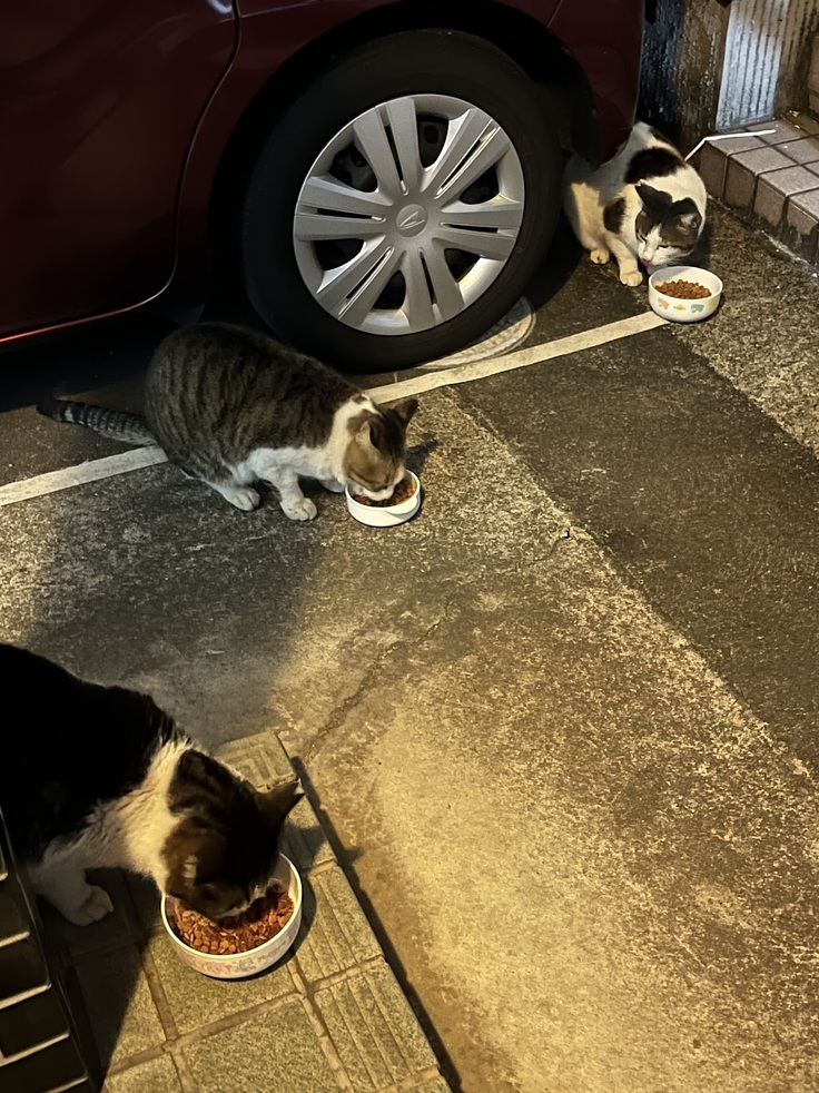 本当は、先に電子レンジで、ご飯を温めて出してあげたいとさえ思いますが、それをする間、更にお外で縮こまって待ってもらうのも過酷すぎるので、せめてもと、ウェットフードをモミモミ、手の熱で温めほぐしてから開封しました。それでも、やっぱり冷たいかなぁ…と思いながらも配っていくと、みんな一斉に黙々と食べ始めます。もう必死です。食べる方も大至急大急ぎです。
