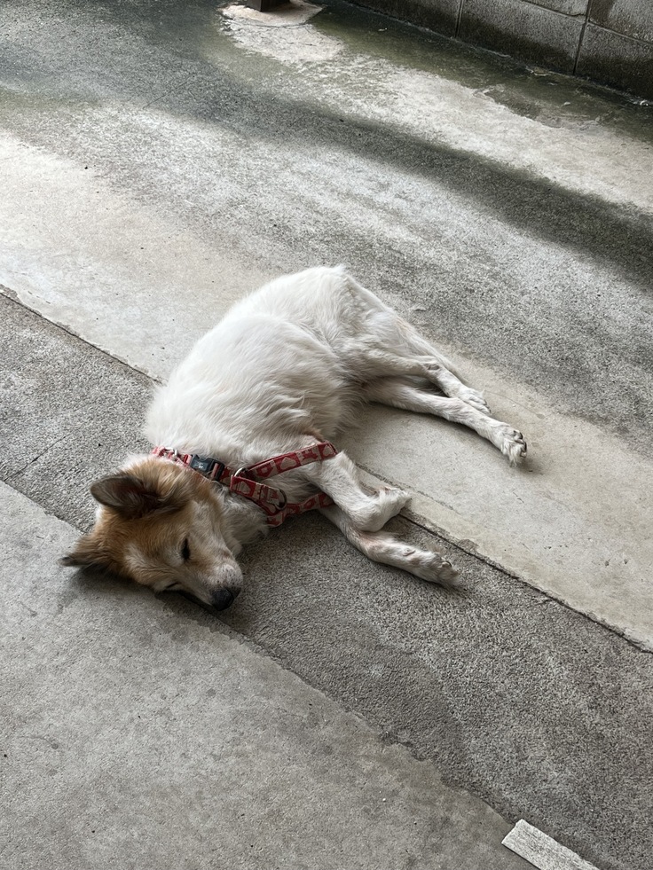 ↑ こちらは、なぜかフカフカの布団には寝ず、いつも、冷たいアスファルトの上を好んで寝ているトットです。(もちろん、クーラー16度設定の屋内にも自由に入れる環境下ですが)