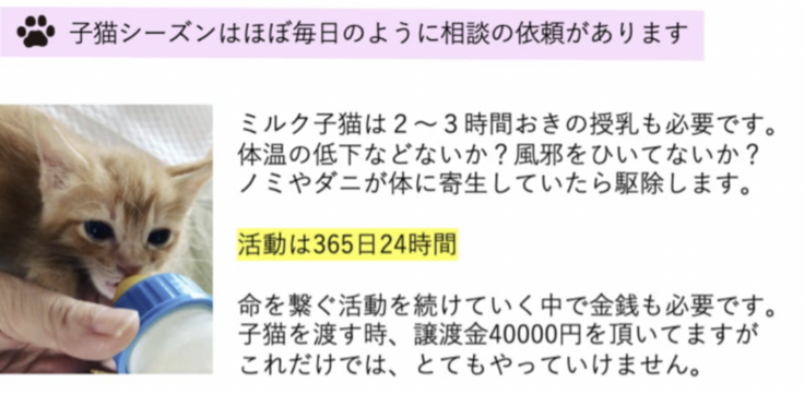 毎年、動物殺処分がなくならない状況です。その中でも多いのが子猫。