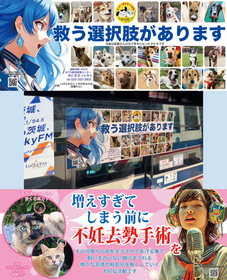 このバス広告は「いばらきのシッポの幸せの会」と保護わんで行っている共同企画です。