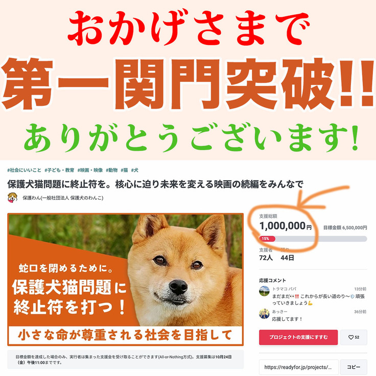 まだ時間があるようには見えるのですが、初期の伸び次第で、一般の方(保護わんを知らない方)へのクラファンの周知に繋がっていくために、とても重要なのです。