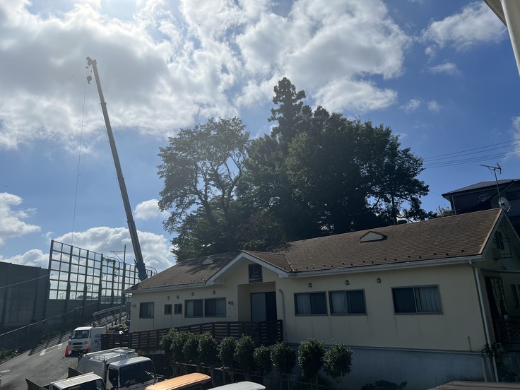 2年前に枝の剪定作業をしていましたが、20m超に育った大木は施設の屋根に計5ヵ所の穴を空け、屋根の梁を折り、大きな枝がささり居室の天井に大きな穴がたくさん空きました。