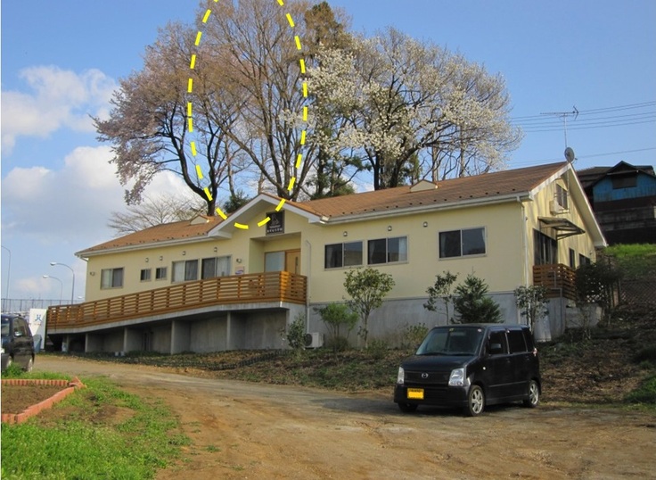 〇被災前の認定試験センター(旧あすなろ学校)※点線内が倒れた大木
