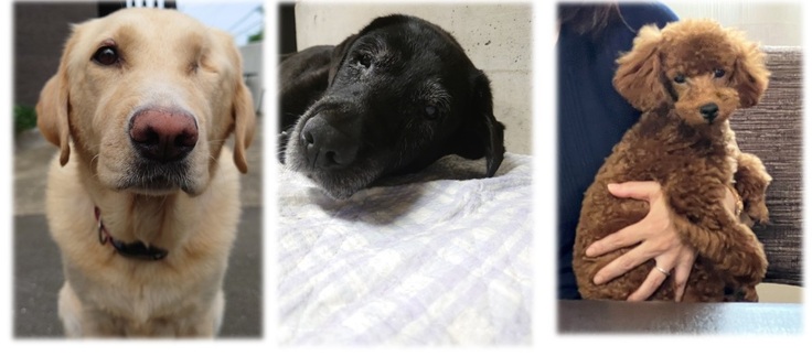 ○左から盲導犬引退犬ポピー、介助犬引退犬アミー、聴導犬パピー大ちゃん