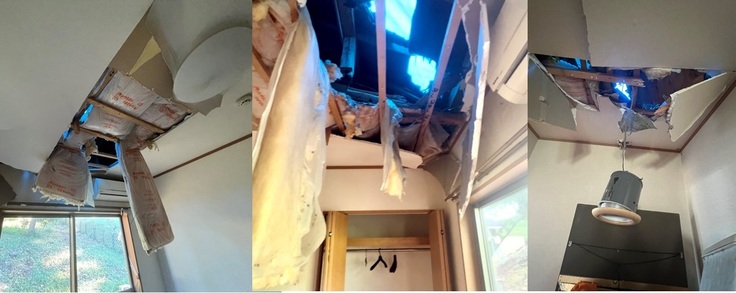 消防が応急処置でブルーシートをかけてくれましたが、倒れ掛かった大木の上から被せるのがやっとで、雨漏りを完全に防ぐことはできず、倒木を撤去するまでの4日間は降雨量が多かったこともあり屋根裏から居室、廊下に至るまで水浸しの状態になってしまいました。