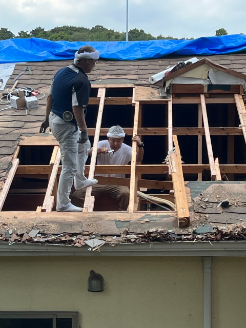 保険会社から保険金260万円(倒木の撤去費用と屋根の修繕費)が振り込まれましたので、屋根を修繕しました!職人さんが何日も屋根に上って、空いた穴を丁寧に塞いでくださいました。これで雨風はしのげると、関係者一同、胸をなでおろしています。