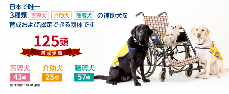 設立以来、私たちは125頭の補助犬(盲導犬43頭、介助犬25頭、聴導犬57頭)を育成し、無償での貸与を行ってまいりました。