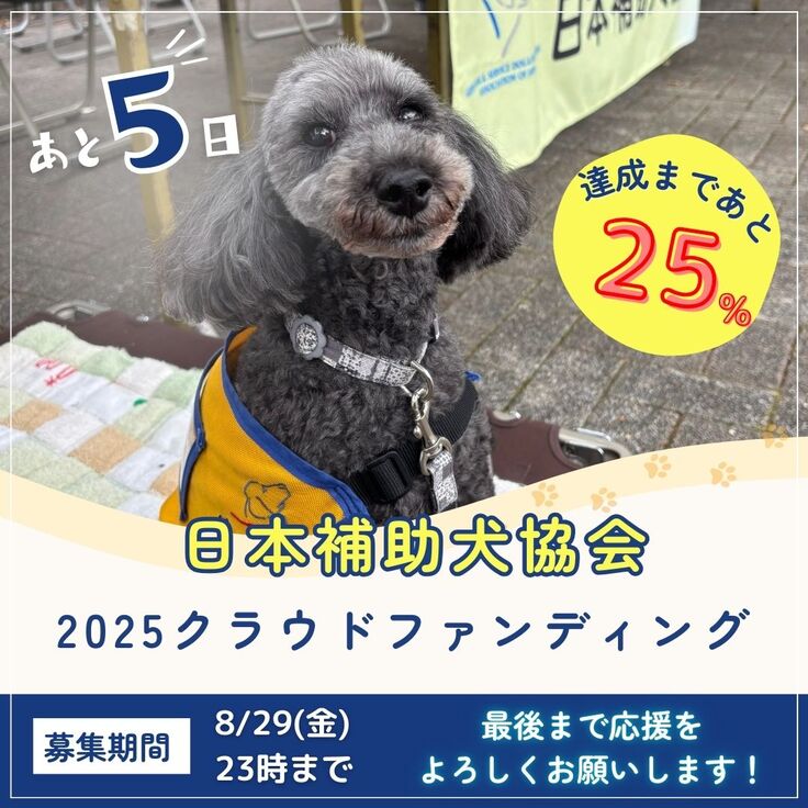 「ほじょ犬育成応援プロジェクト2025」は、残り5日間となりました。皆様のご支援のお陰で目標の75%を達成、538名の方に9,750,000円のご寄付を頂いています。これまでのご支援に心より感謝申し上げます。残り僅かの期間ですが、最後まで皆様の伴走、応援をよろしくお願い申し上げます!!