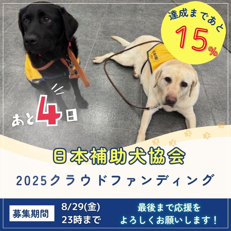 「ほじょ犬育成応援プロジェクト2025」は、目標の85%を達成、563名の方に11,050,000円のご寄付を頂いています。皆様の温かいご支援のお陰で目標達成が射程圏内となっております!!これまでのご支援に心より感謝申し上げます。残り僅かの期間ですが、最後まで皆様の伴走、応援をよろしくお願い申し上げます!!