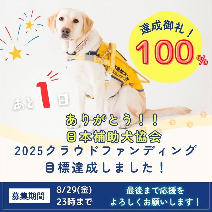 クラウドファンディング「ほじょ犬育成応援プロジェクト2025」は、終了1日前の本日8月28日に目標金額である13,000,000円に到達しプロジェクトを無事成功させることができました。