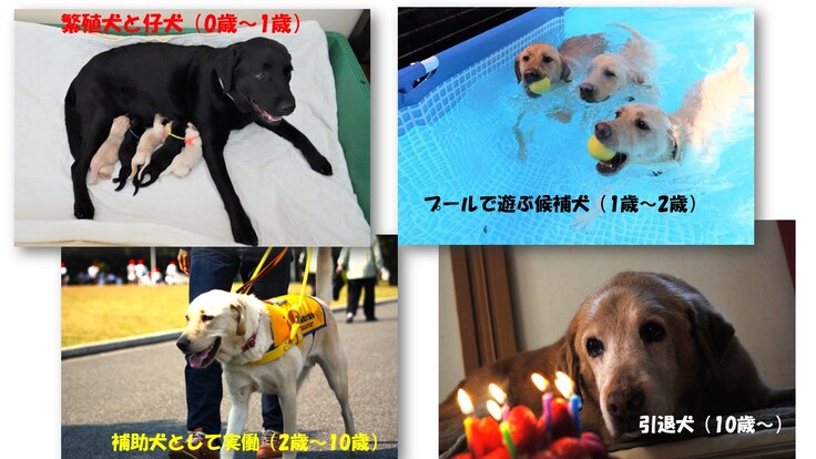 補助犬は生後2ヶ月まで母犬や兄弟達と暮らし、その後、パピー・ファミリーと呼ばれるボランティアのもとで1歳になるまでの約10ヶ月間育てられます。1歳になると訓練センターに戻り、適性評価の結果候補犬となった犬は約1年間の訓練の後、ユーザーのもとで補助犬として実働をします。補助犬としての実働期間は概ね2歳から10歳までの8年間です。10歳となり引退した補助犬は引退犬ボランティアのもとで余生を送ります。日本補助犬協会では、訓練中は担当スタッフが家に連れて帰り、家族として一緒に生活を共にします。犬たちは、パピーファミリーのもとで、スタッフのもとで、ユーザーのもとで、引退犬ファミリーのもとで、家族の一員として一生を送ります。そして、わたしたちは一頭一頭の犬たちが産まれてから亡くなるまでの一生に責任を持ちます。