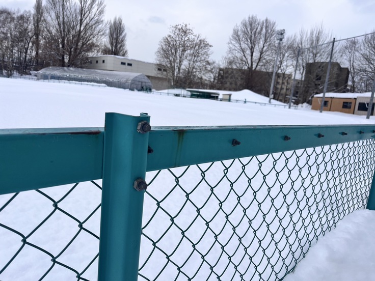 積雪のため少しわかりにくいかもしれませんが、特に状態の酷かったファールゾーン付近のフェンスが改修され、ますます安全にプレーできる環境になりました。春の練習試合では、けがの心配なくのびのびとプレーする選手の姿が見られることと思います✨