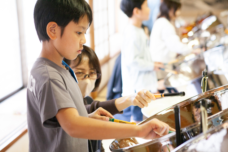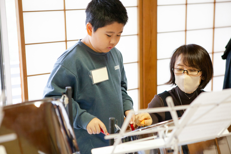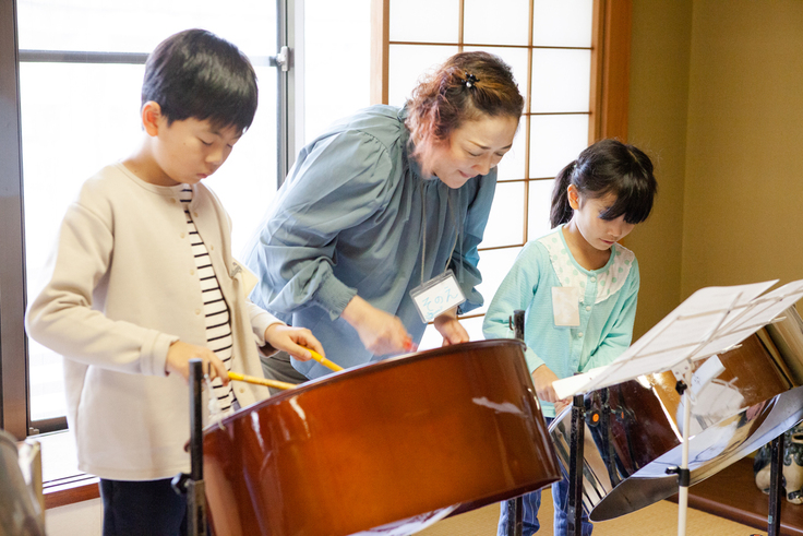 どの位置にどんな音があるのかを探すところから始まります。最初は音階を探しながら、あたふたした演奏でしたが、子どもたちは覚えるのがとても早い…!30分も経つとしっかり演奏がかたちになっています。