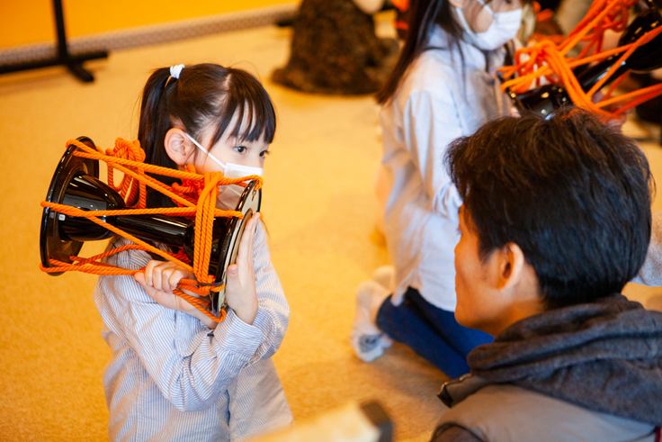 太左衛さんが「さっき覚えたことをお父さん・お母さんに教えてあげましょう!」と一言というと、子どもたちは少し緊張が解けたのか、保護者の方に一生懸命演奏の仕方を教えていました。