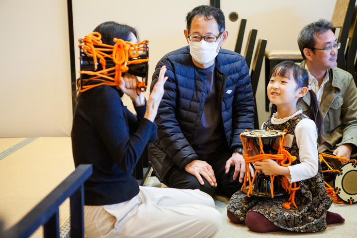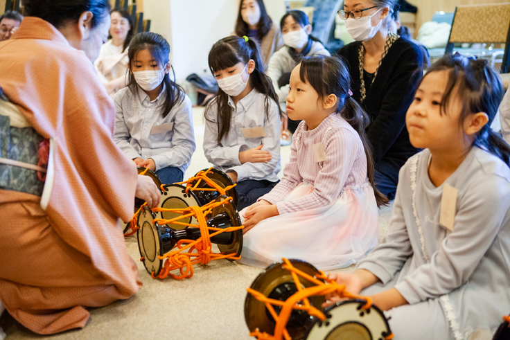 さまざまな種類の和楽器を体験してみることに。参加するお子さんだけでなく、保護者の皆さんにも実際に体験してもらいました。