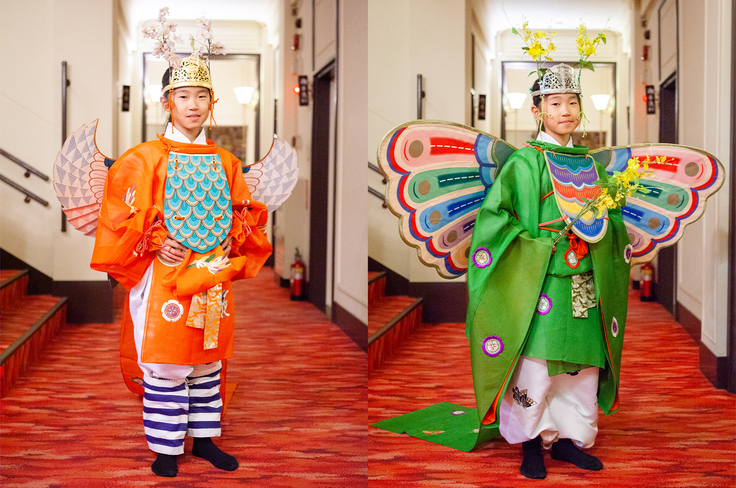 舞楽の「迦陵頻」と「胡蝶」の衣装です。色鮮やかで、美しい刺繍が施された絢爛豪華な装束でした。