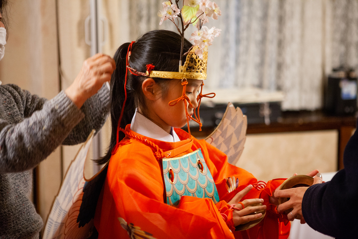 参加者のお子さんは、この日初めて「龍笛」に触れるということで、多度雅楽会の田中松緑さんから楽器の持ち方や演奏の仕方などを簡単に教わっていました。