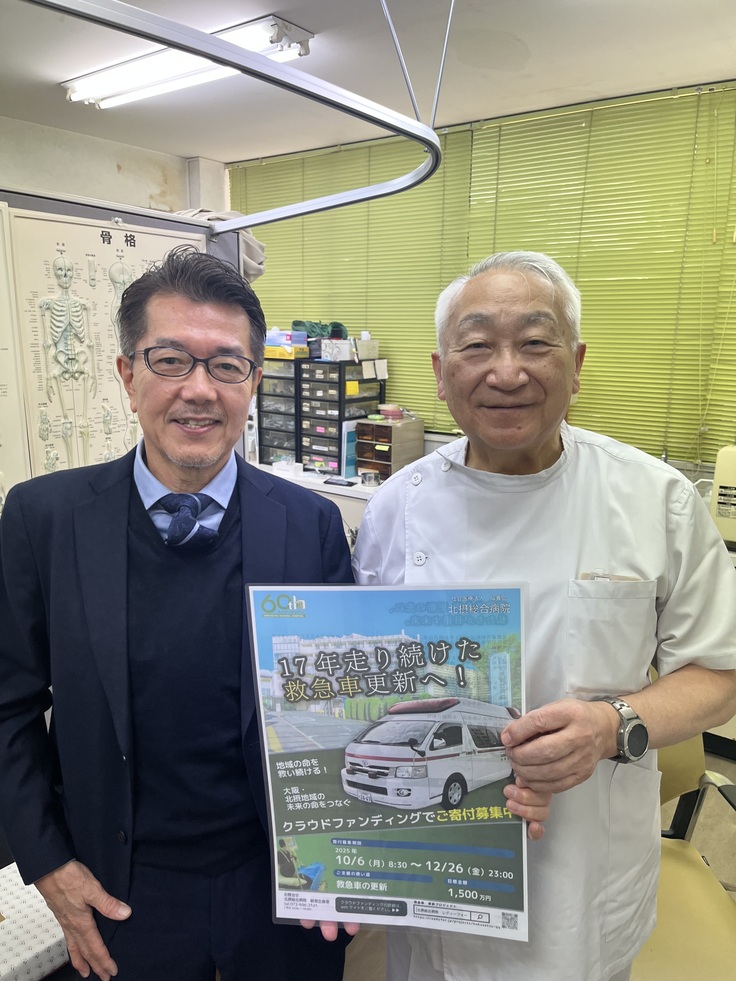 先日、茨木市の茂松整形外科様を訪問し、本プロジェクトの意義にご理解をいただき、力強いご支援を賜りました。茂松先生は、大阪府医師会会長を歴任され、現在は日本医師会副会長として医療界の発展にご尽力されています。当院にとっても、大変心強いご支援となりました。