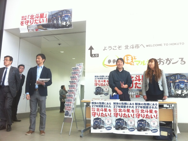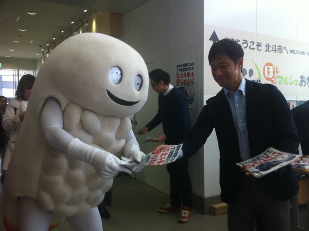 本日4/9、新函館北斗駅にてチラシ配りをおこなっていたところ、北斗市宣伝隊長ずーしーほっきーに遭遇しました!
