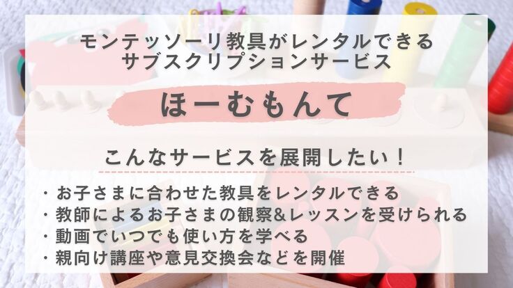 これらの問題を解決し、どの地域に住むどのご家庭でもモンテッソーリ教育を気軽に継続的に受けられるよう、モンテッソーリ教具をレンタルできるサブスクリプションサービス「ほーむもんて」を始めました。