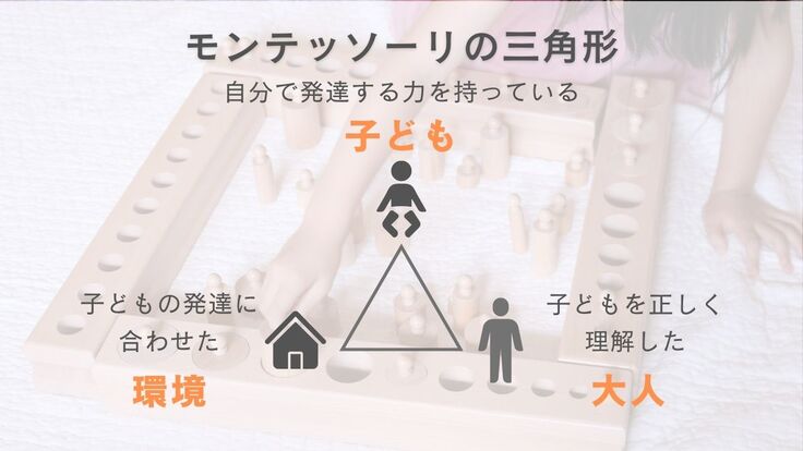 モンテッソーリ教育において大切な要素となるのは「子ども」「環境」「大人」です。
