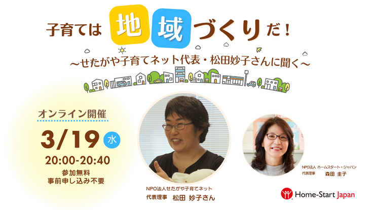 以来、さまざまな子育て支援のメニューを作ってきた松田さんに、なぜ「子育ては地域づくりだ!」と訴え、行動するのか、ホームスタート・ジャパン代表の森田が聞いていきます。