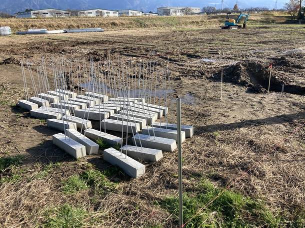 写真は今日の様子です。ユンボ使って穴を掘って、アンカーを入れています。重りですね。
