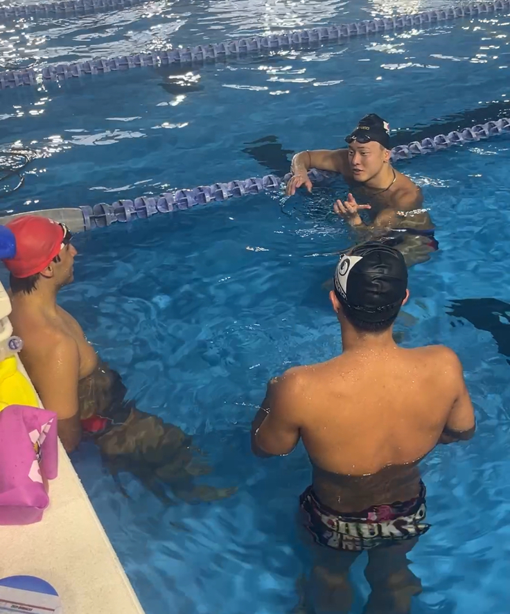 練習後にはパリ五輪平泳ぎ代表の谷口選手からアドバイスを受けていました。
