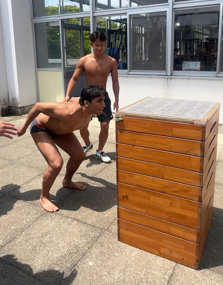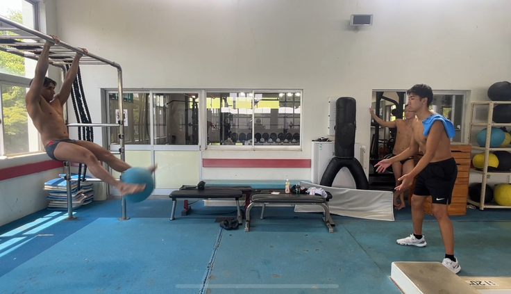 クリーンやボックスジャンプなど複数種目を1時間ほど中京大の選手含め4人で行いました。