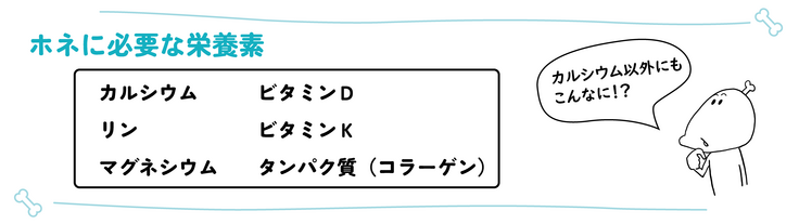 早速ですが、みなさんは『ホネに必要な栄養素』と言われて一番最初に何が思い浮かびますか?おそらく多くの方が「カルシウム」と答えるのではないでしょうか。カルシウムはホネを作るうえでとても大切な栄養素です。しかし、実はホネに必要な栄養素はカルシウムだけではないのです。
