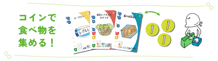 ホネヅクリには、これらの栄養素をもつ80種類以上の食べ物カードが出てきます。ゲーム内で配られる「コイン」を使って、食べ物カードを買い、必要な栄養素を揃え、ホネを作ることがこのゲームの目的です。