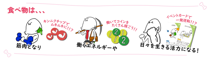 他にも、タンパク質を揃えることで「キンニク」が作れたり、糖や脂質を揃えることで「オシゴト」や「イベント」をすることができます。これらは実際の栄養素の役割と同様に、ゲームを進めるうえでも重要な役割を担っています。