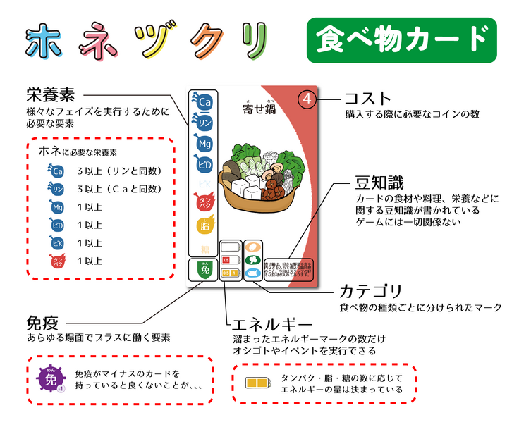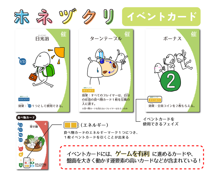 ホネヅクリは「食育カードゲーム」ですが、食育的な役割はゲームとしての楽しさがあって初めて成立するものだと思っています。ここまで栄養について語ってきましたが、ホネヅクリの最大の魅力は作者である私たちが何度プレイしても楽しいと思えるほどのゲームバランスの高さだと自負しています。ホネヅクリを通じて、栄養や食事に興味を持つ「キッカケヅクリ」となれたら嬉しいです。